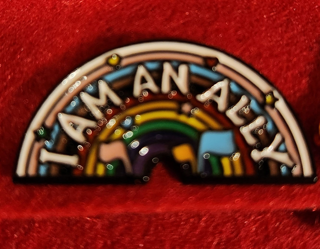 The progressive flag colours displayed as an arch with the message I Am An Ally